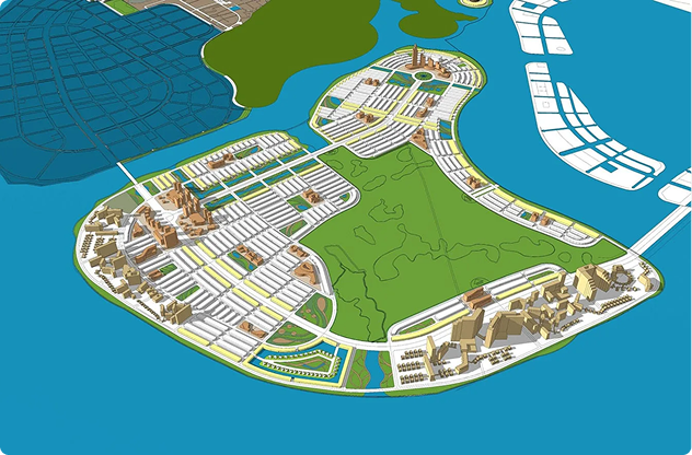 - Các mạch xanh chính (công viên trung tâm, đai xanh ven sông, hành lang bảo vệ tự nhiên) được tổ chức liên kết, đảm bảo tầm nhìn và môi trường sống trong lành xuyên suốt khu đô thị.